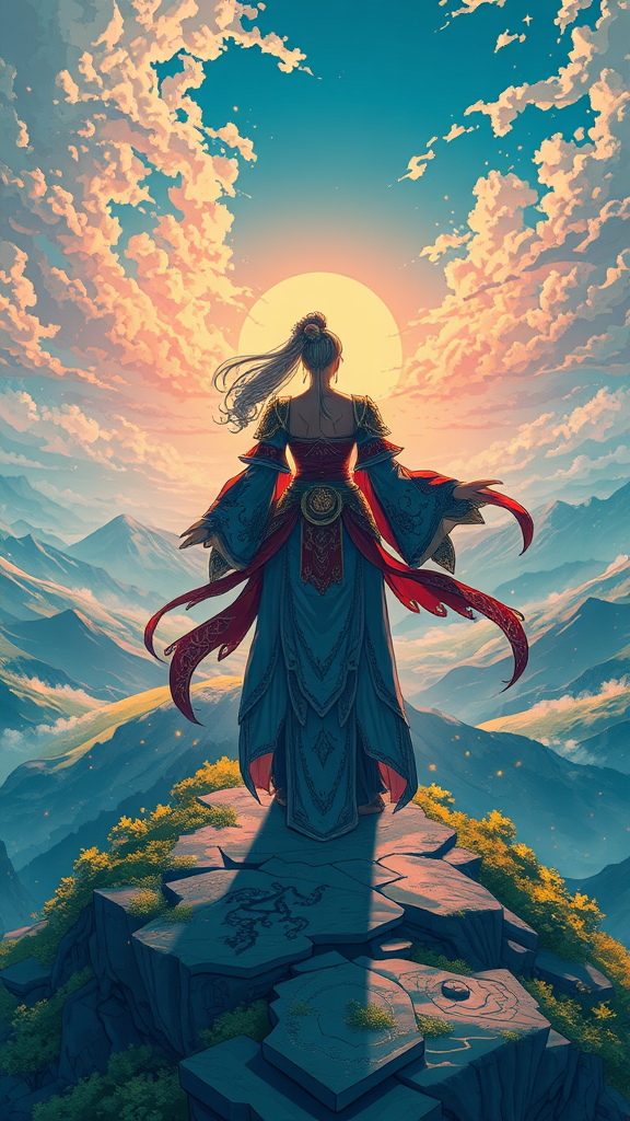A breathtaking anime-style poster of a warrior goddess standing alone on a hill, intricately detailed and vibrant, capturing a panoramic cinematic view. Inspired by the styles of Carne Griffiths, Conrad Roset, and Makoto Shinkai, the artwork features the goddess centered with sweeping landscapes, exuding a sense of solitude and strength. Her attire and surroundings are adorned with exquisite patterns and colors, creating a mesmerizing visual experience that draws the viewer into a world of fantasy and beauty.