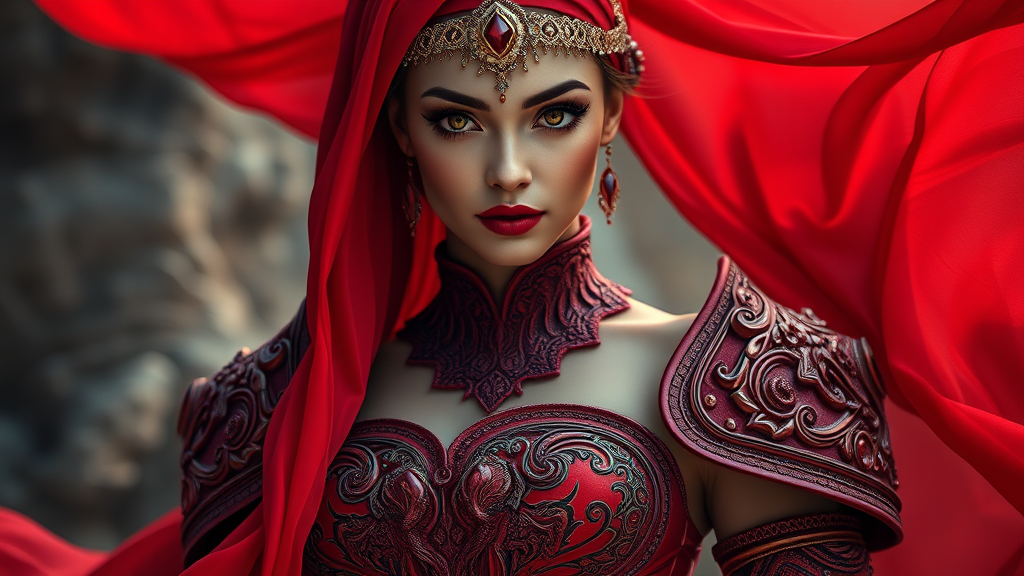 A breathtaking Arab woman in a vibrant red corset and flowing red gown, reminiscent of Karol Bak's intricate style; inspired by Alena Aenami's ethereal touch and Artgerm's dynamic flair, this piece captures a mesmerizing fantasy woman adorned in exquisite red armor. The hyperrealistic fantasy artwork presents a strikingly beautiful lady, the textures and detailing brought to life in 4k and 8k resolution, echoing the artistry of Julie Bell and Beeple while adding a unique mystique.