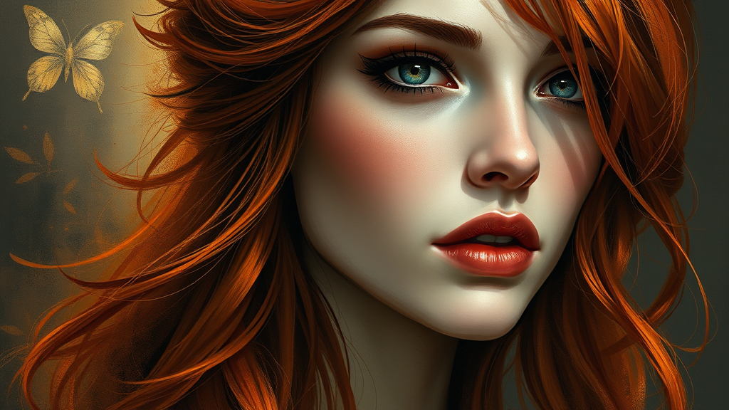 A breathtaking art piece of a fantasy woman with fiery red hair, depicted in a realistic style with fawncore influences, using a palette of deep blacks and warm ambers. The artwork showcases varied brushwork techniques, emphasizing distinctive noses and a captivating use of contrasting dark white and shimmering light gold. The composition is a testament to her ethereal beauty, maintaining an enchanting allure.