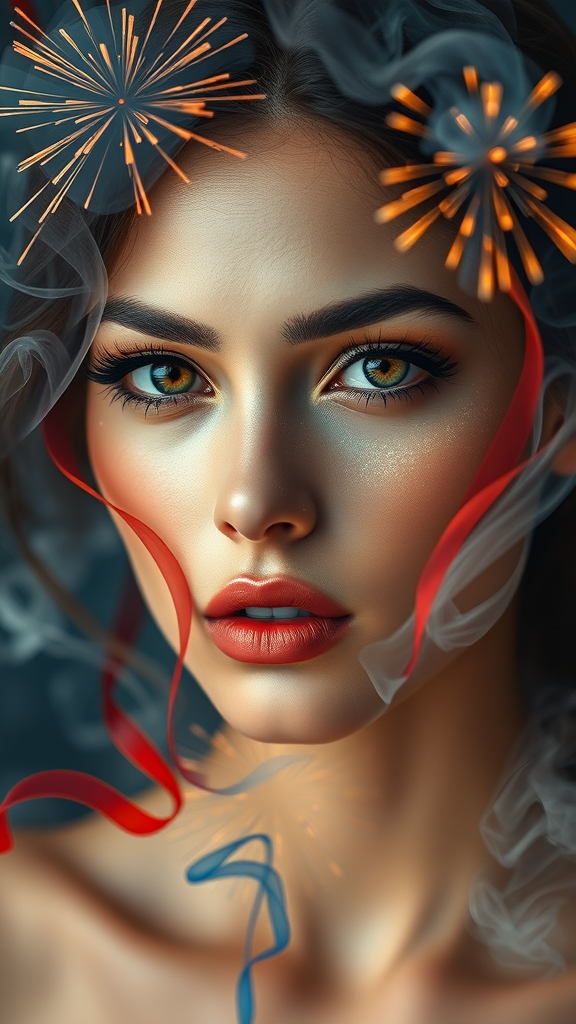 A breathtaking artistic masterpiece, depicting a simple yet captivating image, with harmonious colors blending seamlessly. Set in a surreal, fantasy world, this piece features an artistic close-up of a female supermodel with deep, mesmerizing eyes and a flawlessly symmetrical, stunning face. The background bursts with the ethereal beauty of smoke-like fireworks, intertwined with delicate red, yellow, and blue transparent ink ribbons, creating a dreamlike atmosphere. The pure color matte background enhances the enchanting scene, adding an extra layer of depth and wonder.