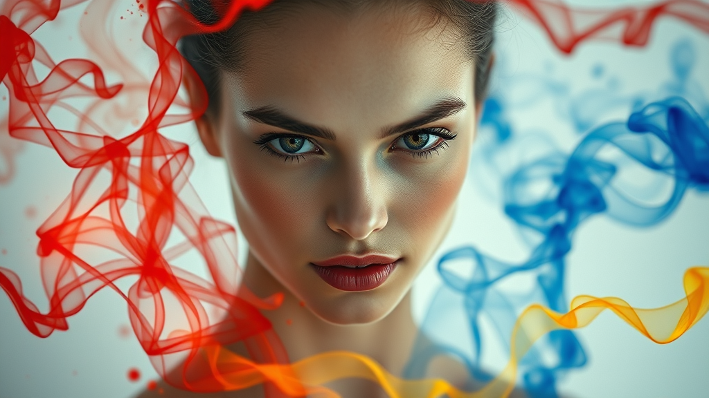 A breathtaking artistic masterpiece, featuring a simple yet captivating image with harmonious color blending, inspired by surrealism and a fantastical realm. The scene presents an ethereal close-up of a female supermodel, her deep eyes radiating mystery, framed by an impeccably symmetrical and stunning face. The backdrop is an explosion of smoke-like fireworks, weaving through red, yellow, and blue transparent ink ribbons, all set against a pristine, matte background that enhances the vibrancy of each hue.