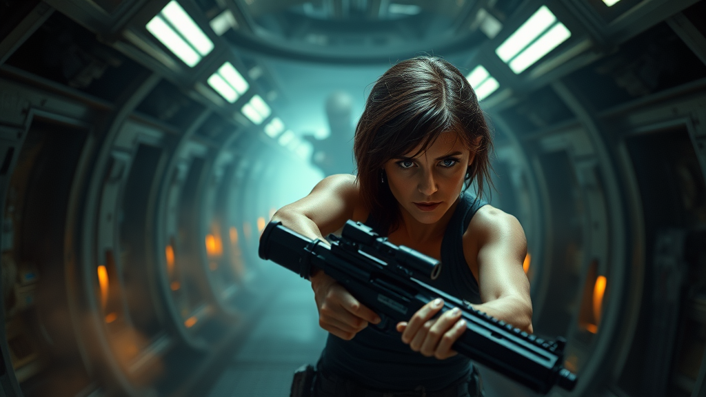 A breathtaking cinematic 8k wallpaper featuring Ellen Ripley from the Alien movie series in an action-packed pose, wielding a futuristic weapon with determination in her eyes, set against the eerie backdrop of a dark and misty spaceship corridor, with subtle hints of the iconic Xenomorph lurking in the shadows, creating a tense yet thrilling atmosphere.