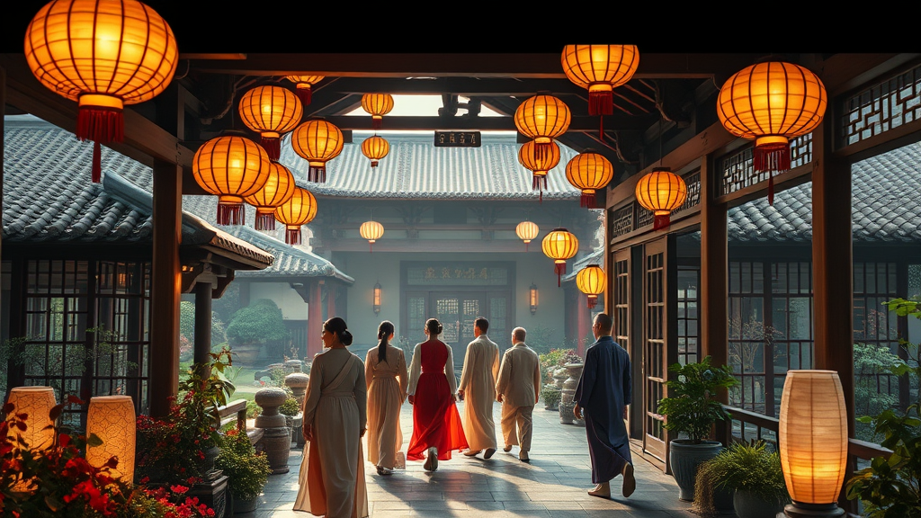 A breathtaking, cinematic depiction of a traditional Chinese teahouse, captured in stunning 8k resolution; the scene is alive with details of exquisite architecture and vibrant garden landscapes. People in elegant, colorful national dress weave gracefully through the setting, their garments reflecting the rich cultural heritage and timeless beauty of Asia. Soft, diffused lighting filters through paper lanterns, casting a warm glow that enhances the serene ambiance, creating an atmosphere that is both tranquil and mesmerizing.