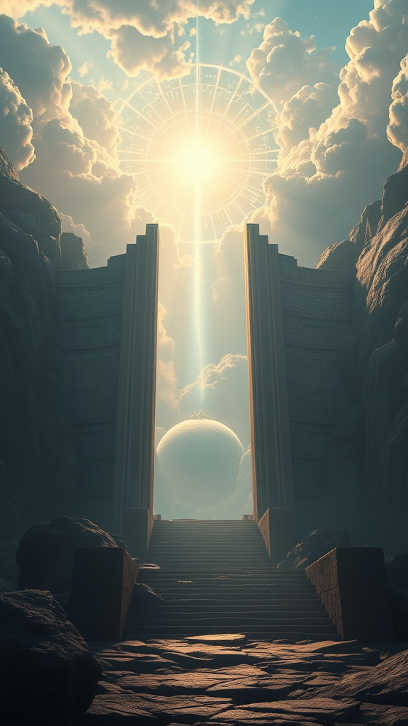 A breathtaking cinematic depiction of the gates to heaven, showcasing exquisite detail and an 8k resolution, offering a realistic and atmospheric essence. Inspired by the styles of Ivan Aivazovsky, Peter Mohrbacher, and Greg Rutkowski, the scene features volumetric light effects and broad illumination. Crafted in the manner of an oil painting, it blends fantasy art with sci-fi realism, capturing a sense of grandeur and otherworldly beauty. Realized in premium print quality, this vision comes to life as if rendered by the Unreal Engine, inviting viewers to explore the ethereal entrance to a celestial realm.