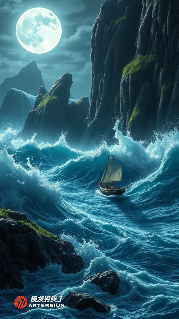 A breathtaking cinematic digital painting capturing sea waves in dazzling detail, crashing with foamy energy against colossal moss-covered rocks under the glow of a full moon. Inspired by the unique styles of Mark Ryden, Pixar, and Hayao Miyazaki, the scene features a tiny ultra-realistic sailing ship navigating the waters with cinematic lighting. Rendered with the intricate and hyper-realistic capabilities of Unreal Engine 5 and Octane Render, this masterpiece offers extreme details and a lush, evocative atmosphere. A visual symphony that might be captured by a Canon 5D, blending the fantastical and the hyper-realistic, as if trending on ArtStation.
