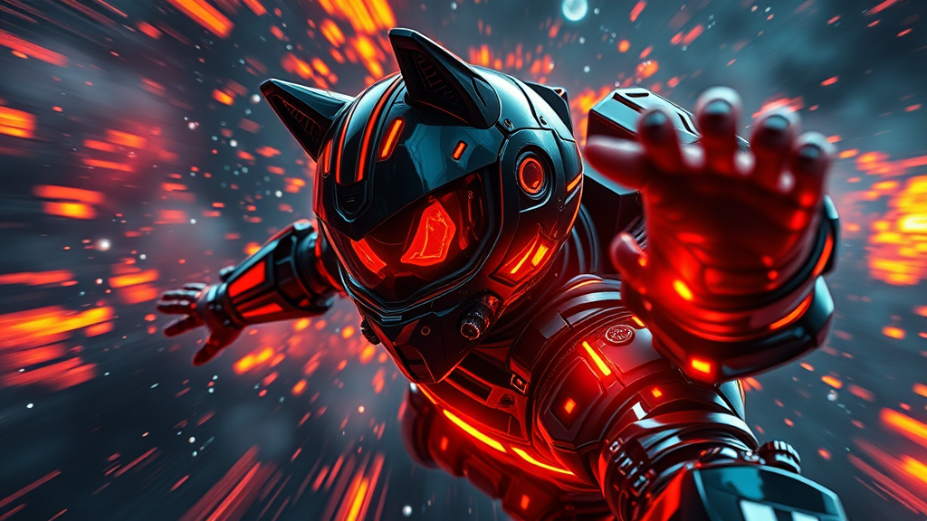 A breathtaking cinematic masterpiece, this digital artwork captures an anime-inspired futuristic pilot in a sleek, aggressively designed wolf helmet, plummeting backwards into the ethereal cosmos. The pilot's suit, a dazzling mix of glossy black and fiery orange, reminiscent of science fiction realms, radiates vibrant, psychedelic energy under dramatic volumetric lighting. The scene is surreal and dreamy, with a palpable sense of panic and fear as the pilot navigates this cosmic dreamscape. The suit's heavy armor gleams with reactor core luminosity, while intense lens flares and shiny surfaces enhance the moody, epic atmosphere. A graceful blend of film grain and bokeh imbue a sense of high-budget cinematography, with a shallow depth of field and vignette focusing on the pilot's expressive terror. The cosmic background, alive with flames, adds a fantastical, mysterious ambiance, blending illustrative, painterly aesthetics and matte painting techniques within a cinemascope frame, creating an unforgettable key visual.