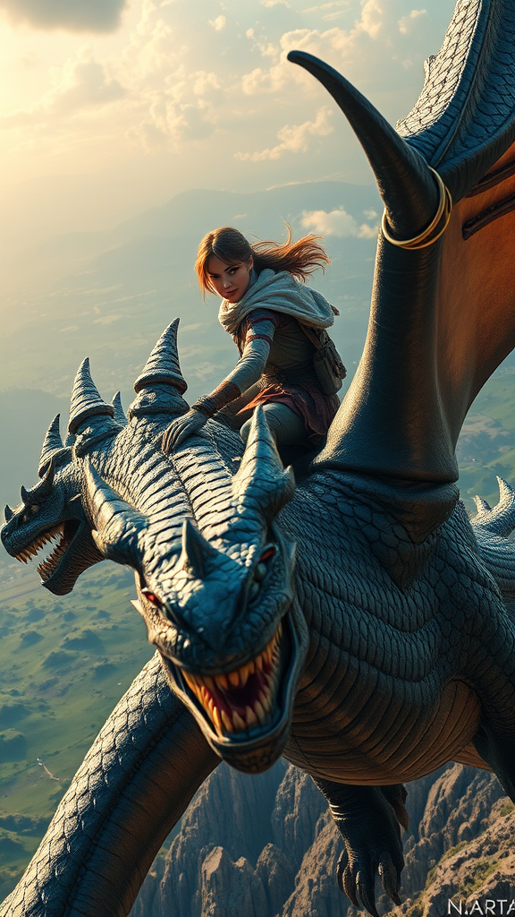A breathtaking, cinematic scene featuring a fearless female adventurer, her eyes filled with determination, as she rides majestically atop a magnificent dragon. The fantastical landscape stretches vast and vibrant below, with intricate details that highlight every scale of the dragon and the adventurer's gear. The scene is rendered in the highest quality, capturing the awe-inspiring grandeur of a mythical journey, reminiscent of an award-winning fantasy epic. The composition is expertly crafted, each element contributing to a visual masterpiece that resonates with epic storytelling, in stunning HD, bringing the 64K ultra-detailing to life.