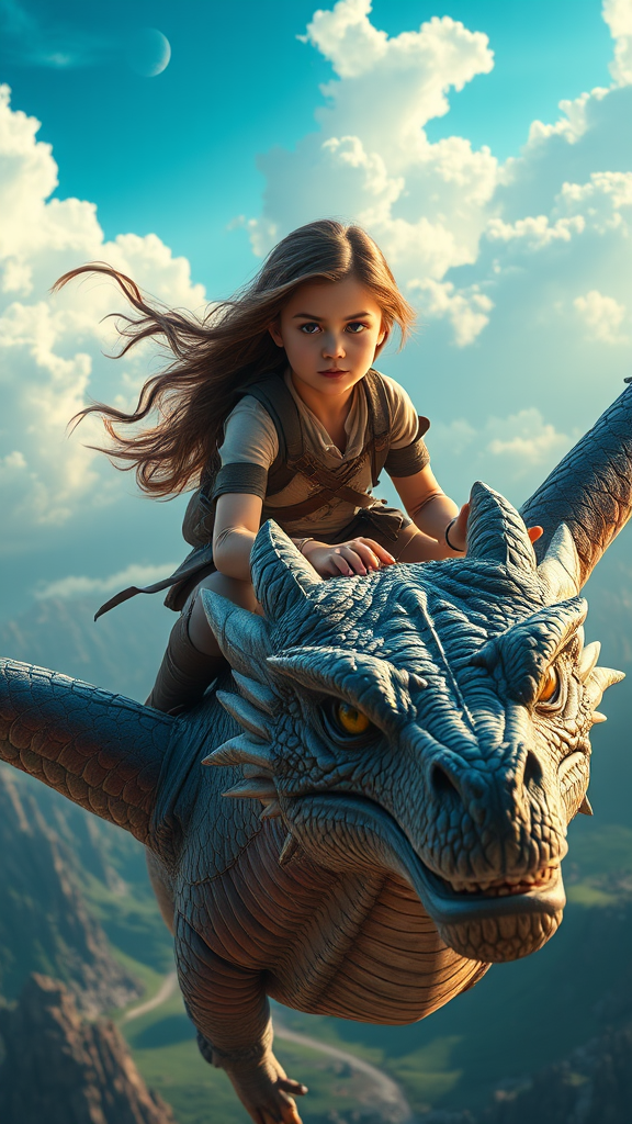 A breathtaking cinematic scene featuring a young female adventurer, her eyes filled with determination and wonder, as she gracefully rides atop a majestic dragon soaring through a surreal, fantasy landscape. The vibrant colors and intricate details are captured in award-winning, masterpiece quality, with a stunning HD 64K resolution that brings every scale of the dragon and every strand of the adventurer's hair to life, creating an awe-inspiring visual experience that immerses viewers in a world of epic quests and mythical creatures.