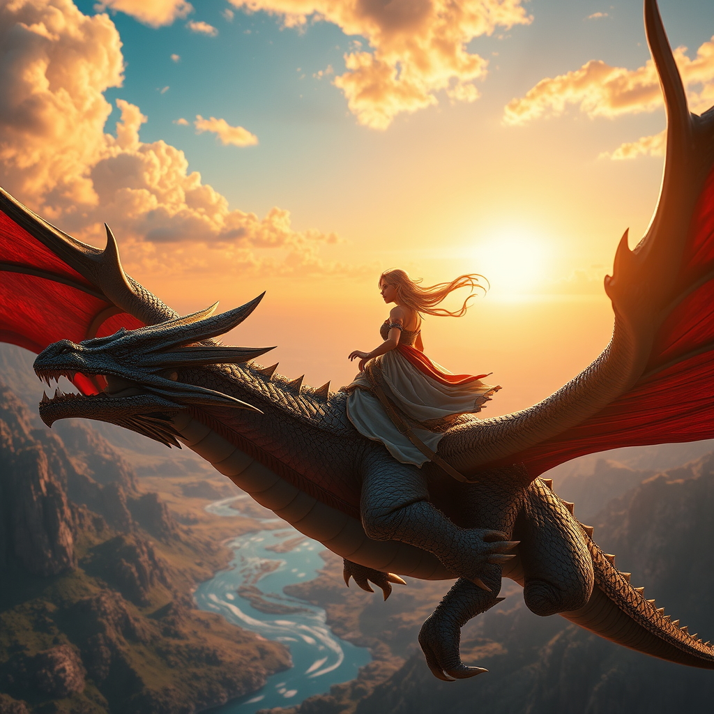 A breathtaking, cinematic scene showcases a lone, fearless heroine, an adventurer of unparalleled spirit, gracefully riding atop a majestic dragon soaring through a vibrant fantasy realm. The imagery is award-winning and crafted with the highest quality precision, featuring mesmerizing detail that brings the enchanting world to life. Her determined gaze meets the horizon as the dragon's wings slice through the crystal-clear sky, reflecting the radiant colors of a setting sun. The masterpiece composition captures the grandeur and mystique of this fantastical journey in stunning HD, akin to 64K quality, inviting viewers into a realm of boundless imagination and adventure.