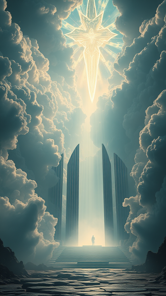 A breathtaking cinematic shot of ethereal gates to heaven, intricately detailed, rendered in stunning 8k realism with an atmospheric touch. Drawing inspiration from the styles of Ivan Aivazovsky, Peter Mohrbacher, and Greg Rutkowski, this scene features mesmerizing volumetric light effects and broad lighting, reminiscent of a masterful oil painting blended with fantasy art. Sci-fi undertones add a unique twist to the portrayal, balanced with elements of realism. Designed for premium prints, the scene evokes the immersive quality of an Unreal Engine creation.