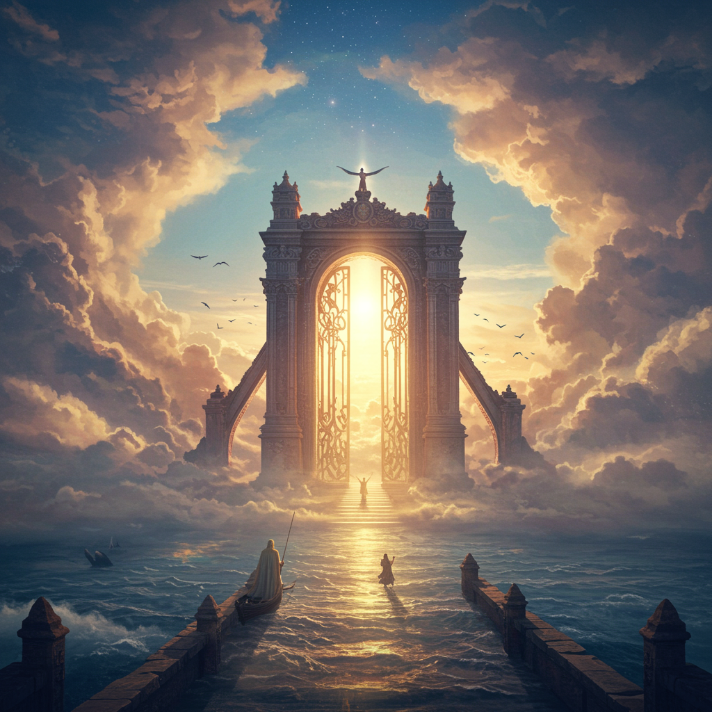 A breathtaking cinematic shot of the gates to heaven, intricately detailed in 8K, blending realism with surreal fantasy elements. Inspired by the styles of Ivan Aivazovsky, Peter Mohrbacher, and Greg Rutkowski, this piece captures an ethereal atmosphere with volumetric light effects and broad illumination, resembling an oil painting merged with sci-fi realism. The composition exudes a sense of awe and wonder, portraying heavenly gates surrounded by celestial hues and luminous clouds, as if rendered in Unreal Engine, ideal for premium prints.