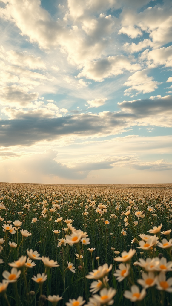 A breathtaking cinematic view of a serene spring landscape unfolds, captured in 8k detail with a lifelike realism akin to an octane render. A tapestry of vibrant flowers, in subtle cream hues, gently sways in the soft breeze under a vast, dynamic sky painted with pastel tones. The scene captures the essence of nature awakening, with delicate shadows and golden sunlight filtering through clouds, casting a warm, ethereal glow across the fields, immersing the viewer in the tranquil beauty of renewal and growth.