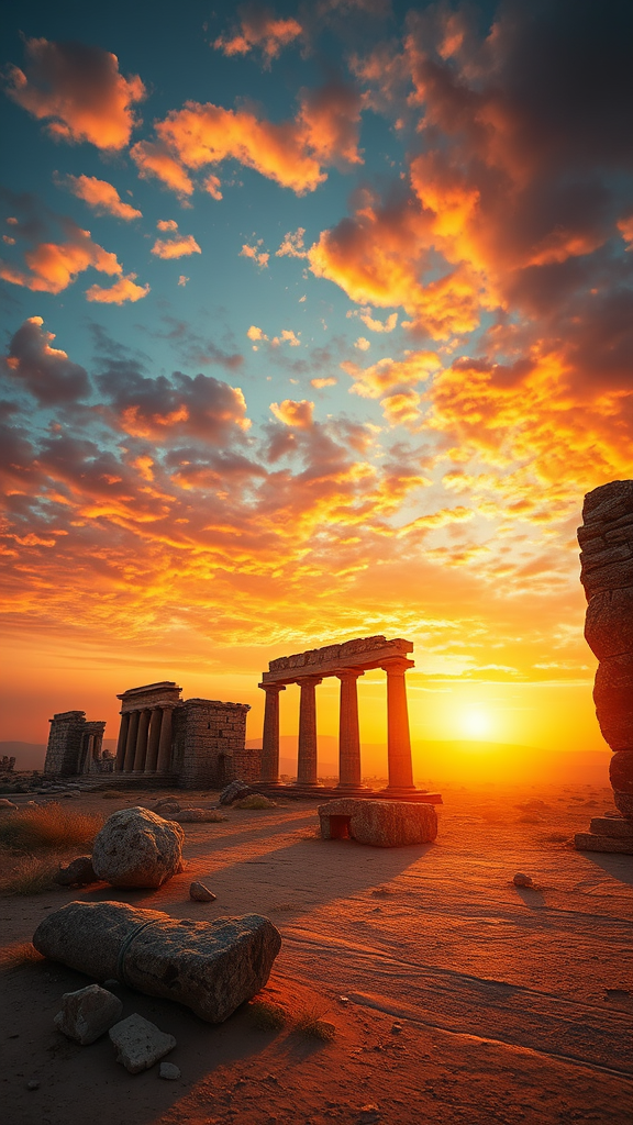 A breathtaking cinematic view of ancient ruins set in a deserted landscape, bathed in the warm hues of a setting sun. The epic sky is alive with vibrant colors, casting dramatic shadows over the intricate stonework. The scene is captured in sharp focus, revealing intricate details of the weathered structures, reminiscent of the works of Greg Rutkowski. The composition, with its meticulous attention to detail, appears ready to grace the trending pages of ArtStation, evoking a sense of timeless beauty and mystery.