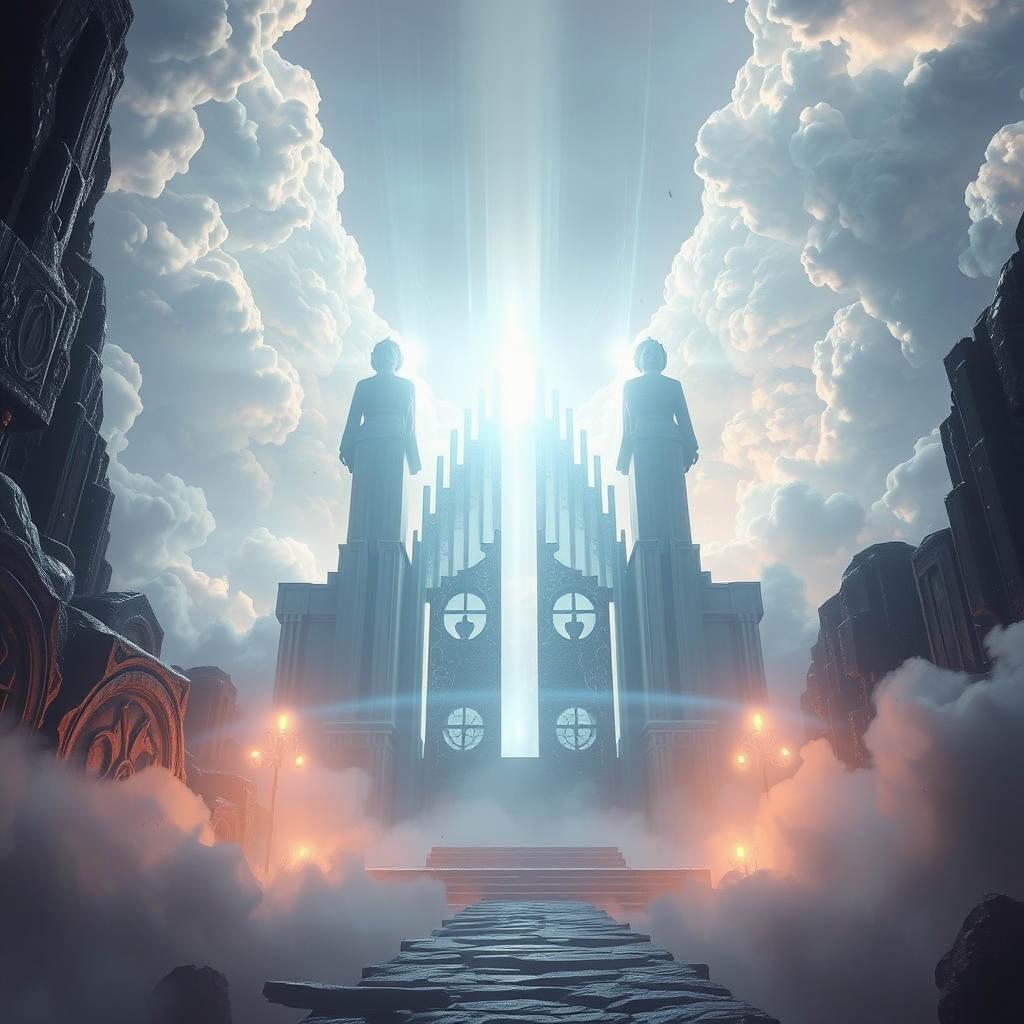 A breathtaking cinematic view of the ethereal gates to heaven, rendered in exquisite detail and stunning realism, with atmospheric elements reminiscent of the masters Ivan Aivazovsky, Peter Mohrbacher, and Greg Rutkowski. The scene bathes in an enchanting volumetric light effect, under broad and expansive lighting, reminiscent of a finely crafted oil painting. This piece combines elements of fantasy art and sci-fi, capturing a surreal yet realistic vision fit for premium prints. Imagine this as though created with the capabilities of Unreal Engine, blending dreamy realism with the allure of fantastical artistry.