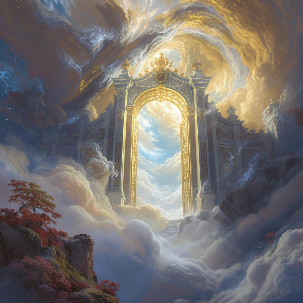 A breathtaking cinematic view of the gates to heaven, intricately detailed and rendered in 8k. This atmospheric masterpiece is inspired by the styles of Ivan Aivazovsky, Peter Mohrbacher, and Greg Rutkowski. It features luminous volumetric lighting and broad, sweeping light effects reminiscent of an oil painting fused with fantasy art. This scene gracefully blends elements of sci-fi and realism, crafted to resemble premium prints. Utilizing the power of Unreal Engine, the artwork creates an otherworldly atmosphere with ethereal clouds and celestial hues, inviting viewers into its serene, majesty-filled landscape.