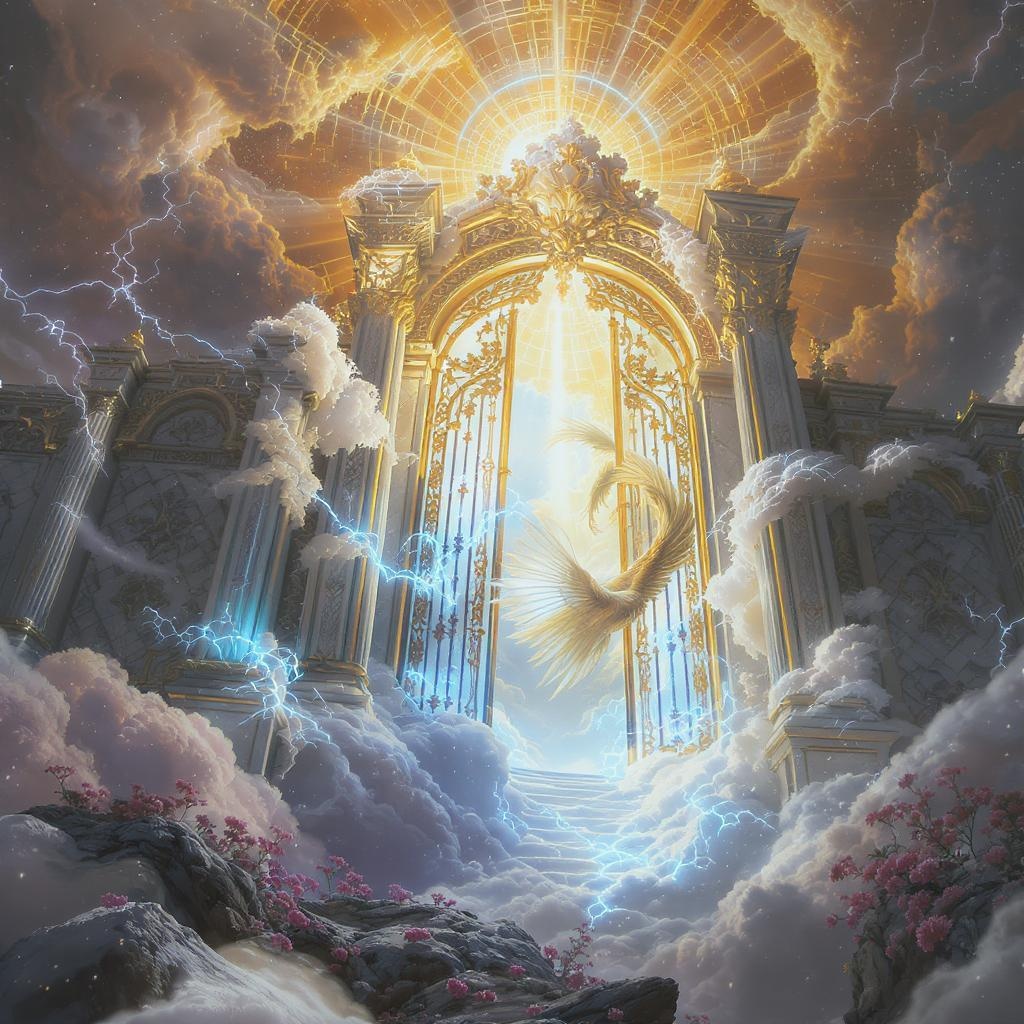 A breathtaking cinematic vision depicting the ethereal gates to heaven, intricately detailed and rendered in stunning 8k resolution, capturing the essence of realism with atmospheric depth. The scene is brought to life in the illustrious styles of Ivan Aivazovsky, Peter Mohrbacher, and Greg Rutkowski, showcasing masterful uses of volumetric light effects and broad lighting. The artwork blends the classic charm of oil painting with fantasy elements and a touch of sci-fi, striking a perfect balance between surreal and real. This premium art piece is designed as if created in Unreal Engine, offering a sense of majesty and wonder, ideal for collectors of high-quality prints.