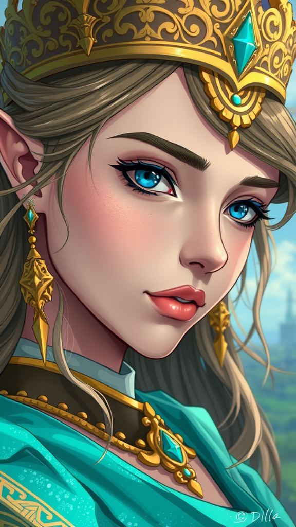 A breathtaking close-up of a regal woman in a shimmering teal dress, adorned with an ornate golden crown, enveloped in a digital anime art style. Her features are meticulously detailed, evoking a sense of nobility akin to the knights of the zodiac. Her expression carries the wisdom of Princess Zelda, set against an ethereal landscape reminiscent of fantastical realms. This illustration shines with highly detailed fanart qualities, capturing the elegance and mystique of an anime fantasy heroine. The clear, refined lines and vibrant colors echo the art style of "Breath of the Wild," presenting a seamless blend of classic anime aesthetics with a modern twist, focusing on the intricate details of this captivating anime character portrait.