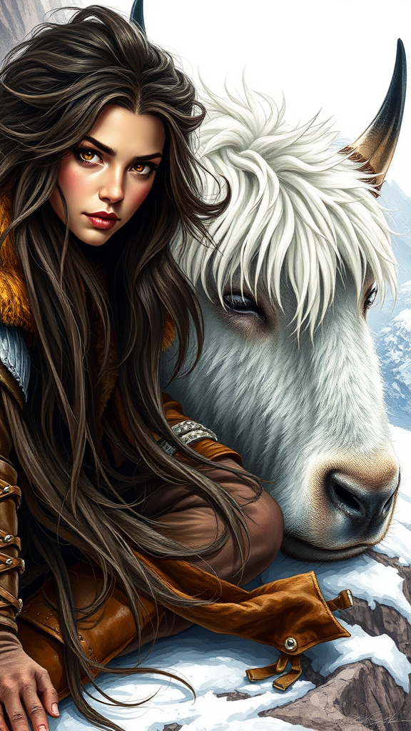 A breathtaking color sketch of a powerful and enchanting barbarian warrioress with intense brown eyes and long, wild dark brown sable hair, peacefully resting beside her majestic white war yak. Her skin is a warm tan, complemented by boots and armor crafted from brown leather and fur. The scene is set against a snowy mountain ledge path, captured in a sketch-style background. The lighting is volumetric and dynamic, enhancing the hyperrealistic and exceptionally detailed portrayal. A dark romantic fantasy ambiance envelops this visually stunning masterpiece, emphasizing her strength and beauty amidst the harsh mountain terrain, with no technical imperfections or distractions.
