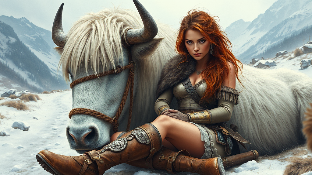 A breathtaking color sketch of a strong and captivating barbarian warrioress, with intense brown eyes and long, tousled sable hair cascading around her shoulders, peacefully resting beside her majestic white war yak. Her sun-kissed skin, complemented by rugged boots, and armor crafted from rich brown leather and fur, adds to her fierce allure. Set against the backdrop of a snowy mountain path, the scene is illuminated with dynamic, volumetric lighting that enhances the hyper-realistic detail of this dark romance fantasy. The artwork is a maximalist masterpiece, free from any distortions or imperfections, capturing the essence of raw beauty and strength in a flawless composition.