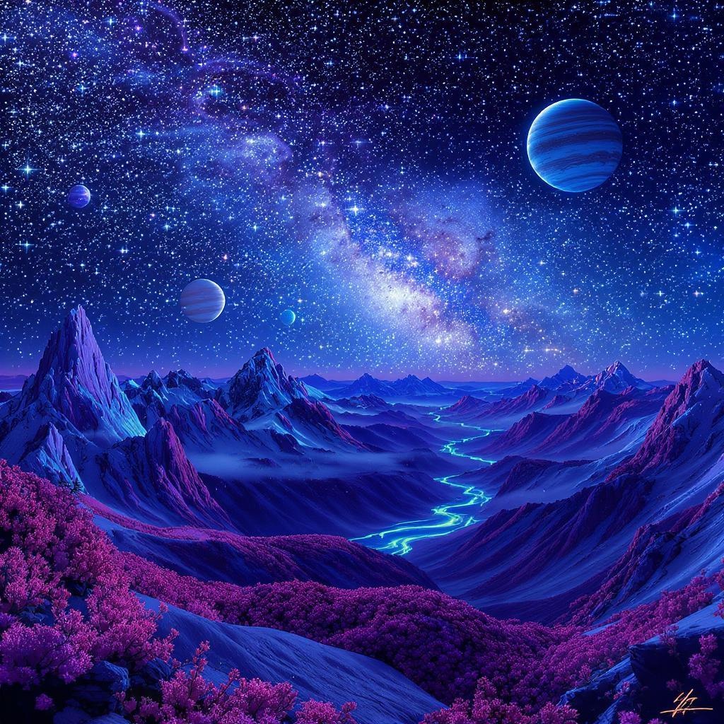 A breathtaking cosmic vista, where shimmering stars and nebulae dance across the night sky, mountain peaks bathed in gentle moonlight, distant planets hovering elegantly in the background, luminous rivers winding through the landscape, with vibrant hues of blue, crimson, and violet, intricately detailed and artistic, ideal for a celestial-themed wallpaper.