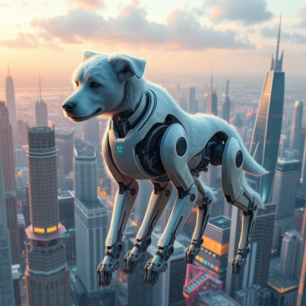 A breathtaking cyberpunk cityscape in ultra-realistic watercolor pastel hues, showcasing a highly detailed robotic dog with natural fur. Two such dogs are featured, their entire forms visible, with one viewed from below. The scene captures the essence of a hyperdetailed urban skyline amidst a futuristic world. Each dog exhibits more than the typical number of legs, adding a surreal twist to their appearance. The overall atmosphere conveys a blend of lush animal fur textures and sleek robotic aesthetics, punctuated by the vibrant colors of the city. As the dogs navigate this urban jungle, their sleek forms become emblematic of both natural and technological evolution.