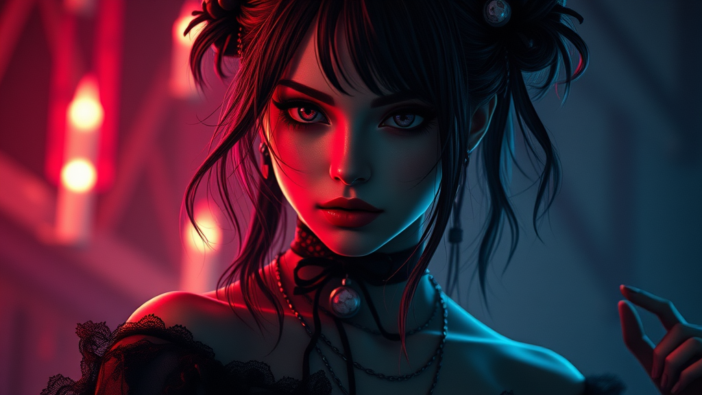 A breathtaking depiction of a female goth with lolita influences, captured in a full body dynamic pose that is perfectly centered and serves as a key visual. The intricate details enhance her stunning beauty, portrayed with precise lineart and vibrant colors. This comprehensive cinematic artwork, reminiscent of Anna Dittmann's style, is rendered in best quality with moody lighting and subtle volumetric fog. A small artist watermark is included, along with copyright information discreetly integrated into the composition.