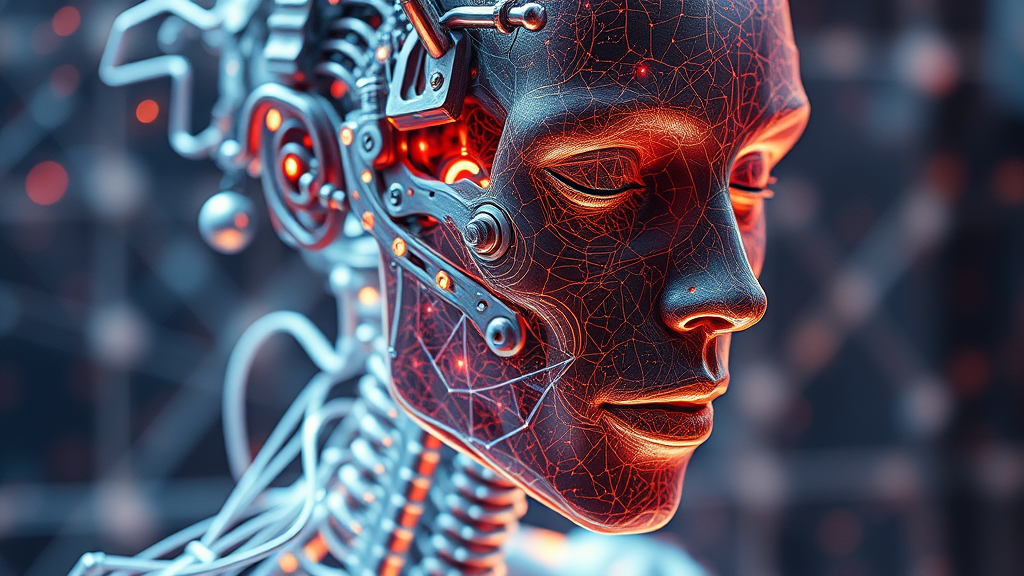 A breathtaking depiction of a mystical neural network being, featuring half of the face as a robotic skeleton and the other half adorned with exquisite facial detailing, viewed from a 45-degree angle. The art is elegant and holographic, combining electro elements with maximum intricacy. The imagery is simultaneously detailed and ethereal, with characteristics of blurred intricacy and a slightly grainy texture. The composition includes subtle nods to plasticity and duplicity while imperfectly capturing elements of anatomy. Despite the presence of abstract features such as limb-like structures and indistinct symbols, the piece omits text, names, signatures, and watermarks, maintaining a somewhat raw aesthetic with a hint of jpeg imperfections.