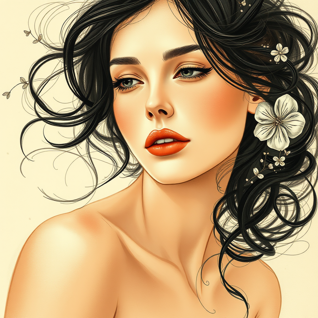 A breathtaking depiction of a woman drawn in the fluid, organic style of nature-inspired Art Nouveau, featuring soft-focus elements and elegantly minimalist sketches. The composition highlights graceful curves and free-flowing brushwork, resembling the beauty and rhythm of a video montage. The artwork, with an aspect ratio of 73:128, surprises with its stunning elegance and understated simplicity, capturing a harmonious blend of natural grace and artistic expression.