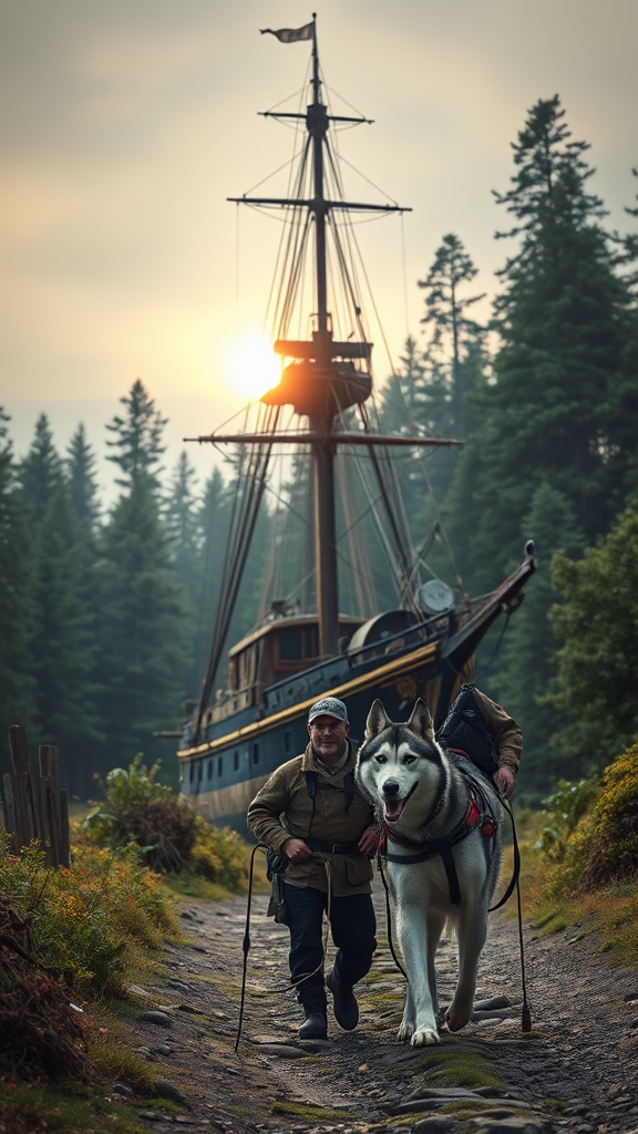 A breathtaking depiction of an ultra-realistic sailing ship set against a serene pale sunrise with dramatic, cinematic lighting. The ship is weathered and dramatic, seen from a low angle, showcasing its intricate details and hyper-realistic textures. The setting is reminiscent of a masterpiece art piece by Studio Ghibli with influences of John William Turner's detailed style. In front of this majestic marine backdrop, a middle-aged man with an average build, salt-and-pepper hair, is highlighted. He is clad in rugged exploration gear and walks alongside a Siberian Husky. The scene is situated on a slightly rugged path leading into a vast and awe-inspiring Patagonian forest, enveloped in lush greenery with towering trees in the backdrop. The overcast sky allows soft, diffused light to gently illuminate the surroundings, underscoring a narrative of peaceful adventure and exploration. The Husky, alert and by the man's side, subtly catches the light, revealing the fine details of its fur. This composition captures Patagonia's untouched wilderness and dramatic landscape with extreme detailing in textures and realistic color tones, compelling viewers to feel the call of exploration.