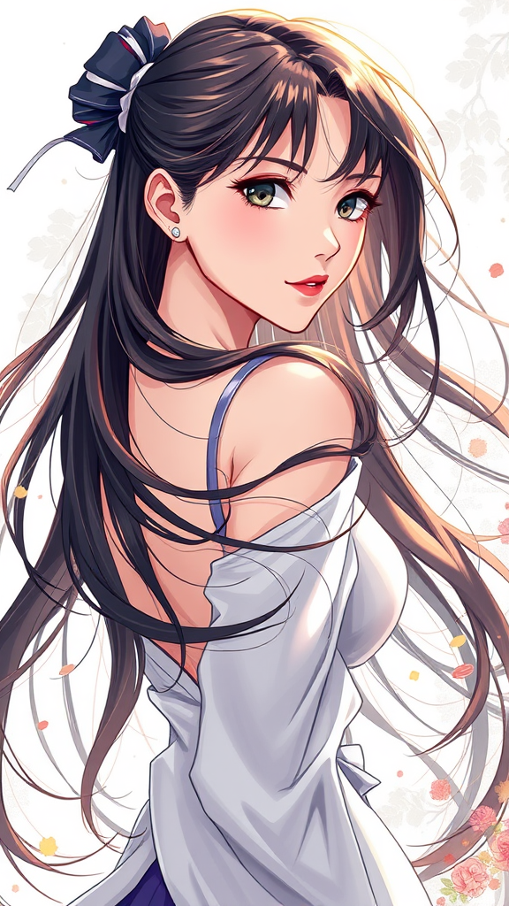 A breathtaking digital illustration of a 20-year-old woman turning her back to the viewer, striking a captivating pose with her long flowing hair. Her expression is enticing and mysterious, rendered in natural and vibrant colors with exquisite detail. The artwork embraces an unforgettable fusion of niji, comics, and anime styles, focusing on artistic flair and character design. The background is subtly abstract, enhancing the central figure's allure without distractions. Meticulous attention is given to proportions and anatomy, highlighting the elegance and fluidity of her form, eliminating any imperfections or distortions for a seamless and enchanting visual experience.