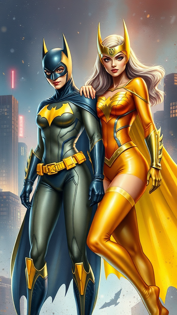 A breathtaking digital illustration of DC Comics characters Batgirl and Supergirl in stunning alternate yellow costumes, exuding a coy and alluring presence. The image showcases their full bodies, intricately detailed with perfect anatomy and dynamic poses reminiscent of Kim Jung Gi's legendary style. Set against a cyberpunk backdrop that captures the essence of freedom and soul, the watercolor painting approach delivers a smooth yet sharp focus, drawing influence from the unique art styles of Carne Griffiths and Wadim Kashin. This piece stands out as an award-winning masterpiece, embodying a fusion of concept art and comic style, approaching perfection with its captivating, highly detailed depiction.