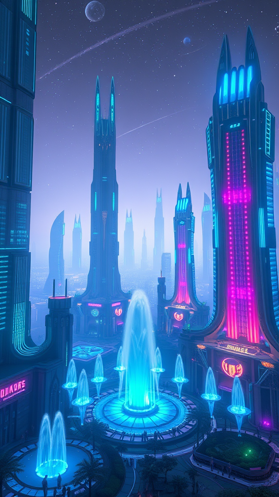 A breathtaking digital image of a futuristic cityscape reveals the advanced architecture and technology of an alien civilization, crafted in a highly detailed, cinematic style that is trending on Artstation. Towering skyscrapers dominate the skyline, each featuring a distinct design and shimmering facade made from innovative materials. Dynamic lighting in vivid blue, purple, and hints of emerald green electrifies the panorama as floating holographic fountains dance in mid-air, surrounded by lush gardens and avant-garde sculptures. The background is a smooth field of space, dotted with twinkling stars and distant planets, offering a striking contrast between the city's organic splendor and the infinite reaches of the cosmos. This image, marked by a moody celestial atmosphere, employs soft lighting and HDRI for unparalleled realism, utilizing top-tier equipment like 35mm, Zeiss, and Hasselblad to capture every detail. The hyper-realistic image boasts lens flare effects and a style reminiscent of a matte painting or concept art, with intricate architectural details and a soft render that meets the quality standards of CGSociety and Octane Render. The final piece is an exemplary digital artwork, inspiring and meticulously created, suitable for magazine features or high-quality wallpaper displays.
