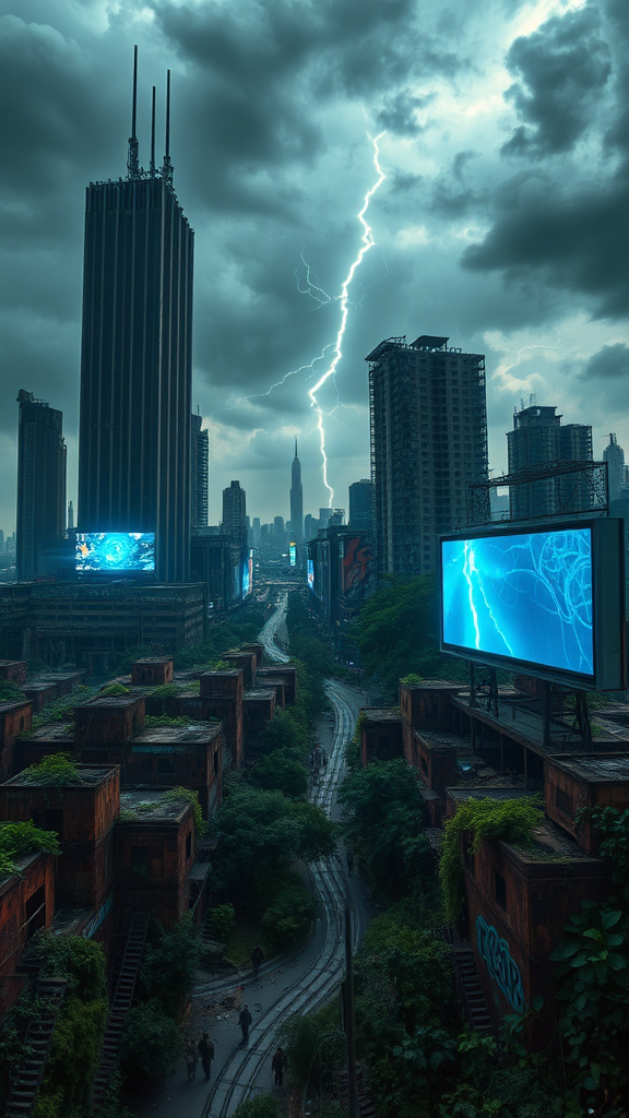 A breathtaking dystopian landscape unfolds, where towering, crumbling skyscrapers pierce through an ominous, stormy sky; a rusted cityscape lies in decay, yet vibrant hues of neon graffiti breathe color into the ruins; remnants of humanity navigate through winding streets overgrown with lush, reclaiming vegetation; a flickering holographic billboard casts ghostly blue light across the scene, creating a sense of haunting beauty amidst desolation; the air crackles with tension as distant thunder rumbles, hinting at a story of survival and resilience.
