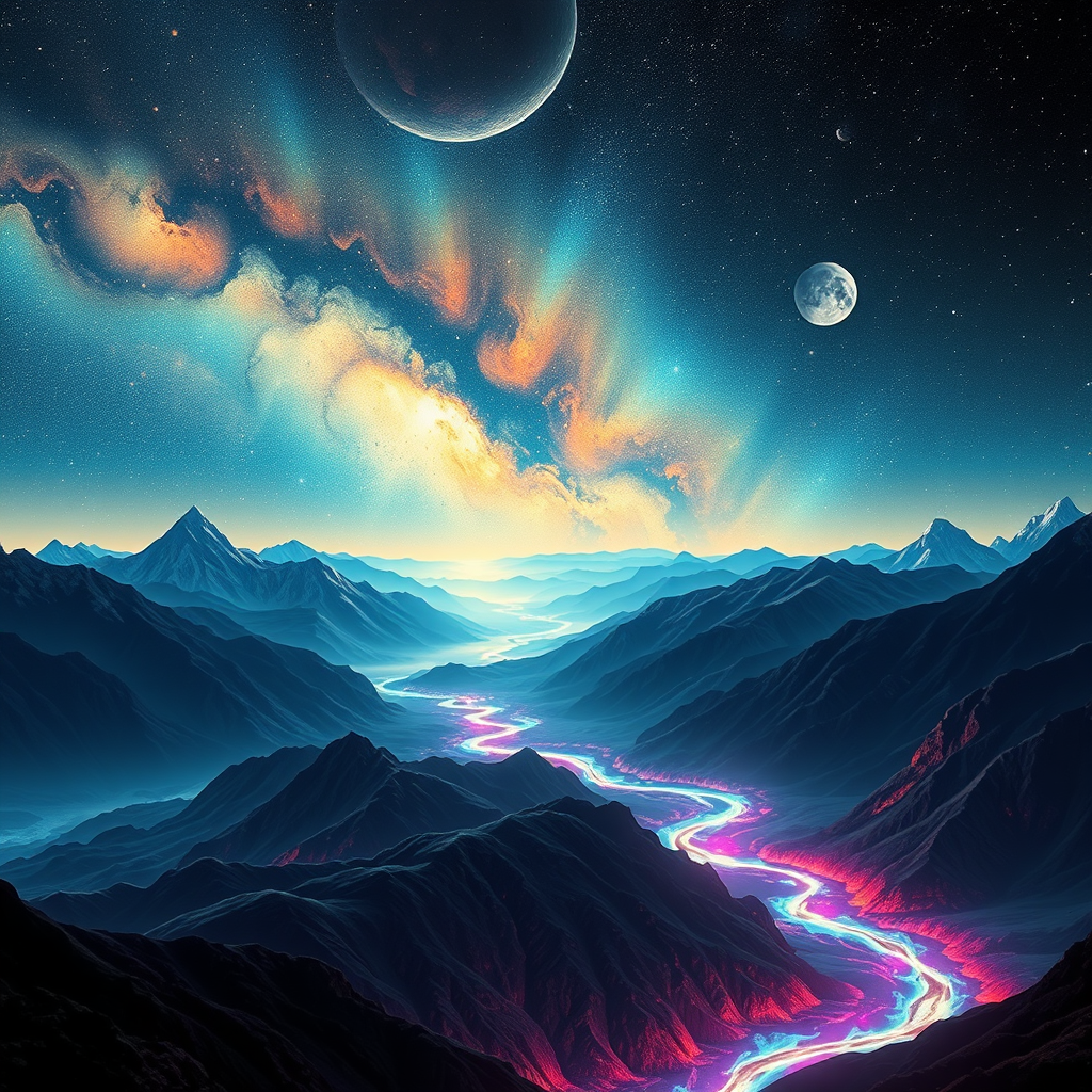 A breathtaking expanse of the cosmos stretches overhead, with radiant stars and swirling nebulae painting a mesmerizing tapestry across the night sky. Majestic mountains stand silhouetted against the backdrop, their peaks bathed in a gentle, silvery moonlight. In the distance, planets drift serenely, adding a sense of mystery and wonder to the scene. Ethereal rivers, aglow with an otherworldly light, weave through the landscape, their luminescence casting vibrant hues of azure, crimson, and violet. The scene is intricately detailed and artistically rendered, capturing the enchanting beauty of a cosmic wonderland, ideal for a stellar-themed wallpaper.