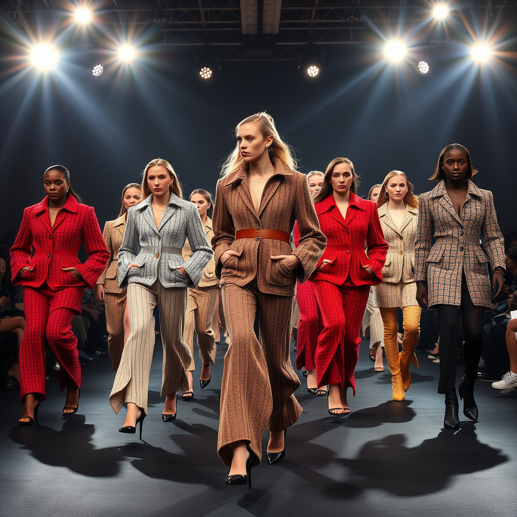 A breathtaking fashion show featuring models in dramatic Hypersize knit suits, their exaggerated proportions capturing attention under dazzling spotlights; each ensemble combines bold textures with intricate detailing, complemented by sky-high heels, offering an avant-garde twist on haute couture as they stride confidently down the catwalk.