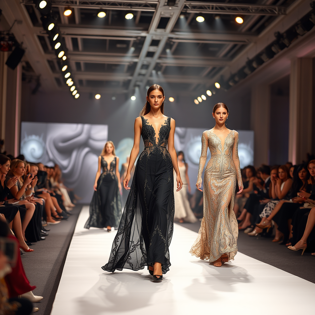 A breathtaking fashion show unfolds with models gliding gracefully on the runway, showcasing exquisite haute couture creations. The stunning outfits captivate with their intricate detailing, each stitch and fabric choice thoughtfully considered. Under the bright spotlights, the catwalk becomes a stage for art and elegance, where every movement reveals the harmonious blend of innovation and tradition, each garment telling its own unique story.