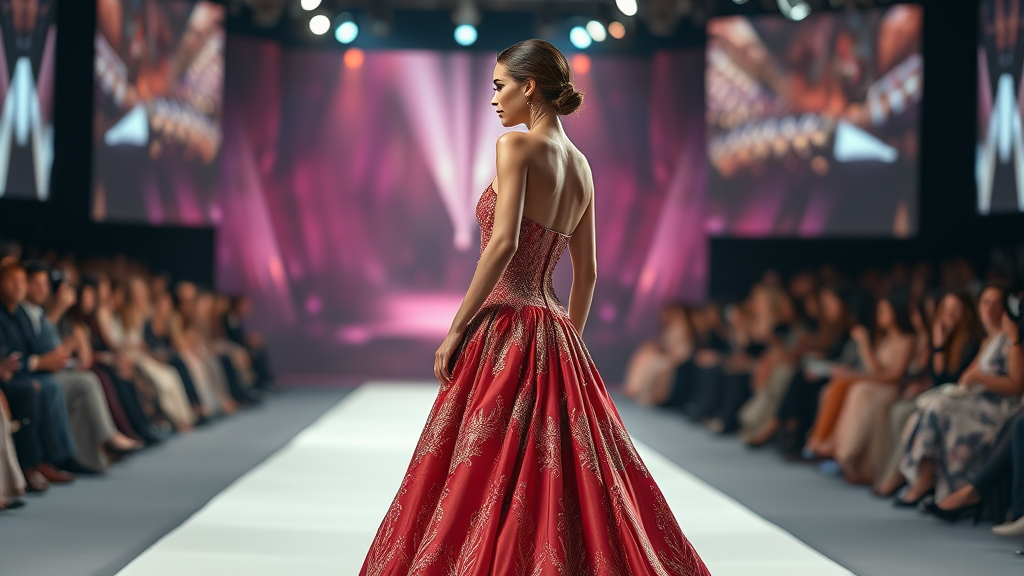 A breathtaking female model standing confidently at the end of a runway during a high-profile fashion show, wearing a stunning and elegant, highly detailed full-length gown. The scene is captured in sharp focus with cinematic lighting, providing a rich, immersive experience in 4k UHD quality, perfectly highlighting the exquisite craftsmanship of the dress and the grandeur of the event.
