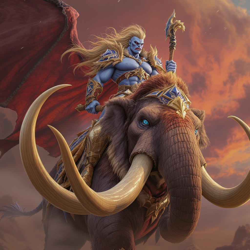 A breathtaking full body image of a blue-skinned orc warrior, proudly mounted on a regal and sharply tusked mammoth. The warrior boasts a strikingly beautiful face, surrounded by vivid and harmonious colors. The artwork exudes elegance and is designed in hyper-realistic digital art, with an 8K resolution, resembling the detail and precision of Unreal Engine 5. The piece captures dramatic lighting, reminiscent of Brom, making it a standout on Artstation. The orc's eyes are intensely detailed, and the masterwork is a testament to hyperrealism, with each element being intricately rendered. This concept art presents a mid shot with dramatic color depth, side lighting, and a colorful backdrop. The composition successfully avoids issues like low quality, unintended text, or any anatomical inaccuracies, ensuring a clear and defined portrayal of this majestic scene.