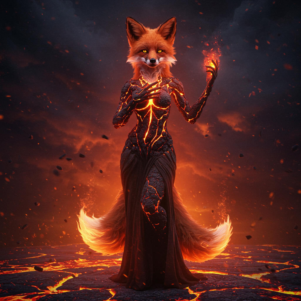 A breathtaking full body portrait of a fox lady composed of magma and lava, radiating a warm glow, inspired by the style of Charlie Bowater. The scene features a volumetric atmosphere, with sharp focus on her beautiful face and delicate hands. The artwork is high resolution, vivid, and intricately detailed, showcasing precise linework and a dynamic, cinematic composition. The fox lady stands in a dramatic pose, encapsulated in a comprehensive, award-worthy digital art piece that is trending on ArtStation. The image is marked by vibrant colors and stunning realism, presented in 4K UHD without any distortions, unwanted elements, or artifacts.