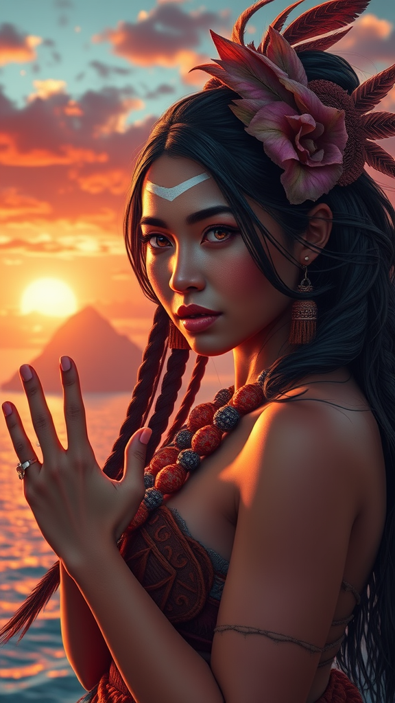 A breathtaking full body portrait of a Maori woman set against a picturesque island backdrop at sunset. Styled in the essence of Charlie Bowater, the artwork features a volumetric atmosphere, showcasing a beautiful face and graceful hands in sharp focus and the best quality. The intricate and vibrant digital art captures her dynamic pose with insanely detailed, precise linework. This award-worthy 4k UHD masterpiece, reminiscent of a cinematic experience, trends on ArtStation for its max detail and high resolution. The portrait is devoid of any distracting elements such as weapons or eyewear, focusing purely on the stunning and captivating composition.