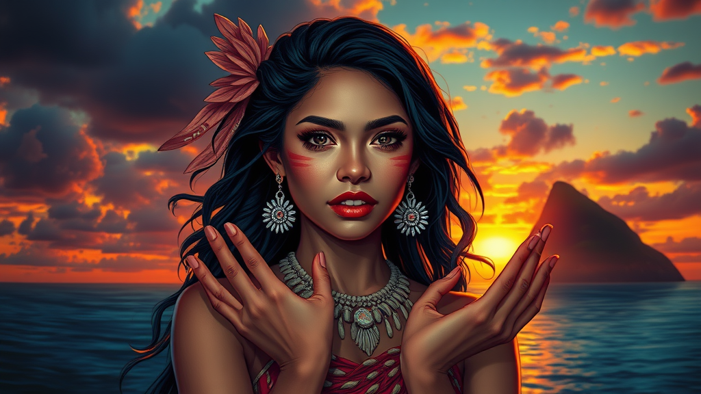 A breathtaking full body portrait of a Maori woman set against an island backdrop at sunset, with inspiration drawn from the style of Charlie Bowater. The scene features a volumetric atmosphere with best quality, sharp focus on her beautiful face and elegant hands. The artwork is high-resolution, vibrant, and intricately detailed with precise lineart. Showcase a comprehensive cinematic feel with dynamic pose in 4k UHD. The digital art is of award-winning quality, trending on ArtStation. The portrait maintains artistic integrity without low resolution issues, text overlays, missing or extra digits, anatomical errors, or any other visual distractions. It exudes a sense of wonder, color, and cultural richness, free from any confusing elements or extraneous marks.