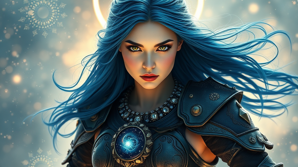 A breathtaking full-body portrait of a mesmerizing woman in motion, her complexion a luminous white, adorned with a necklace encrusted with gemstones containing a swirling universe. Her long, cascading blue hair frames her captivating green eyes, embodying a femme fatale allure—irresistible and enchanting. She dons an intricately decorated, jet-black battle armor, a masterpiece of design, shimmering with ornate details. The scene creates a double exposure effect, with her figure bathed in a celestial glow within an artistic background. Draped in an ethereal gossamer web of cosmos, forming a diamond shape around her, the setting is cinematic and dreamlike, beautifully symmetrical, and meticulously crafted. Captured in an ultra-wide shot, the atmosphere is hypermaximalist and alive with vibrant colors, suffused with radiant light. A halo accentuates her presence, rendered in ultra-realistic detail, the illustration astonishingly lifelike and intricately detailed.