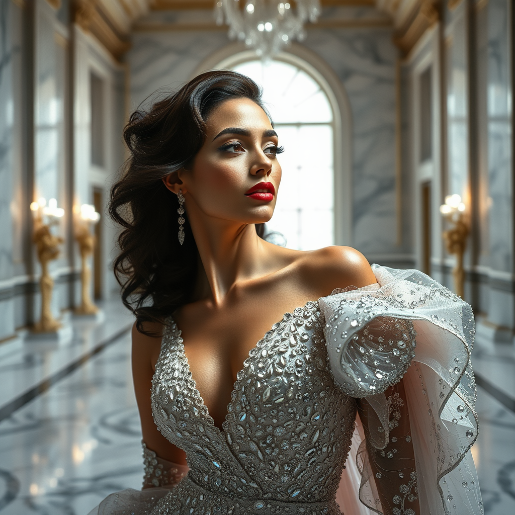 A breathtaking full body portrait of a stunning woman swathed in a gown of shimmering Swarovski crystals, exuding sultry elegance, captured in a grand white marble hall. The scene is reminiscent of a collaborative style between the brilliance of Joyce Ballantyne Brand and the opulence of Roberto Cavalli, interwoven with Saul Bass's cinematic influence. Every facet is captured with hyperrealistic precision, using vibrant colors and exquisite volumetric lighting. The portrait is meticulously retouched by Pratik Naik, with the incredible clarity of a Sony Alpha 1 camera, featuring an 85mm lens, f/1.4 aperture, 1/500 shutter speed, and ISO 100 film. This awe-inspiring image, available in UHD, HDH, HDR, and resolutions up to 32k, radiates with vivid photographic realism and intricate detail.