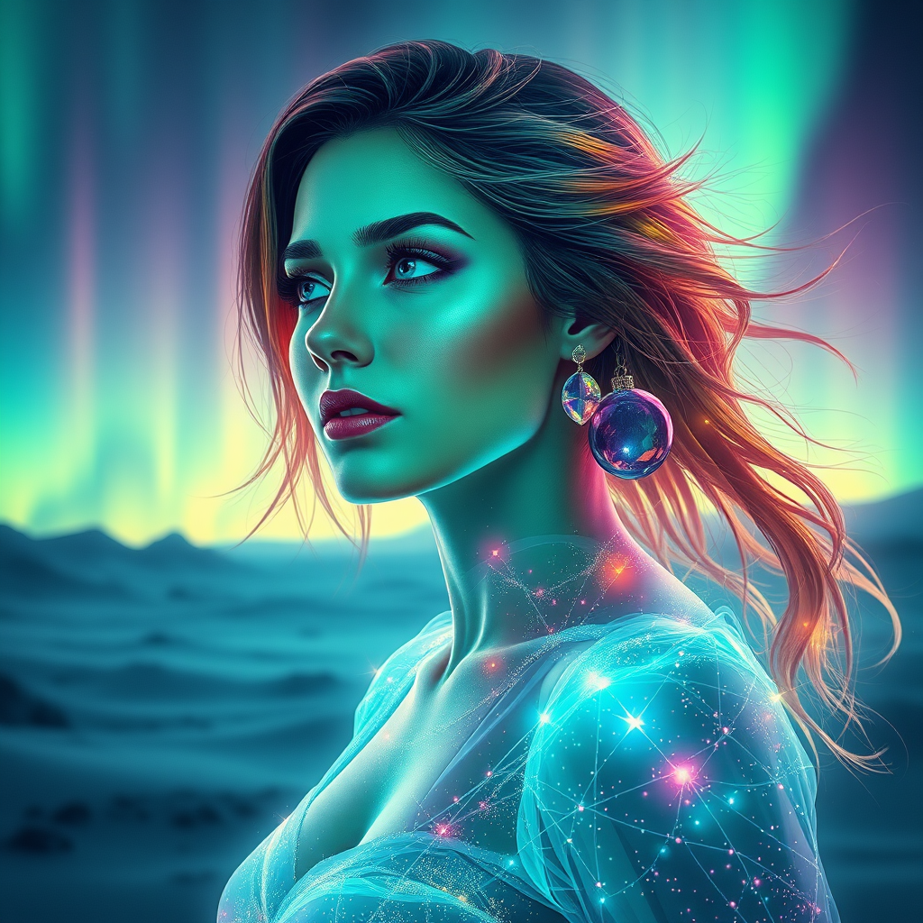 A breathtaking full body portrait of a woman composed of shimmering aurora borealis, radiating vibrant hues. The piece boasts exceptional quality with sharp focus, ultra-high resolution, and intricate details akin to Nene Thomas' artwork. Set within a volumetric, atmospheric landscape, the composition features precise line art and a dynamic, cinematic pose. The artwork exemplifies award-winning digital mastery, trending on ArtStation for its comprehensive detail and 4k UHD brilliance.
