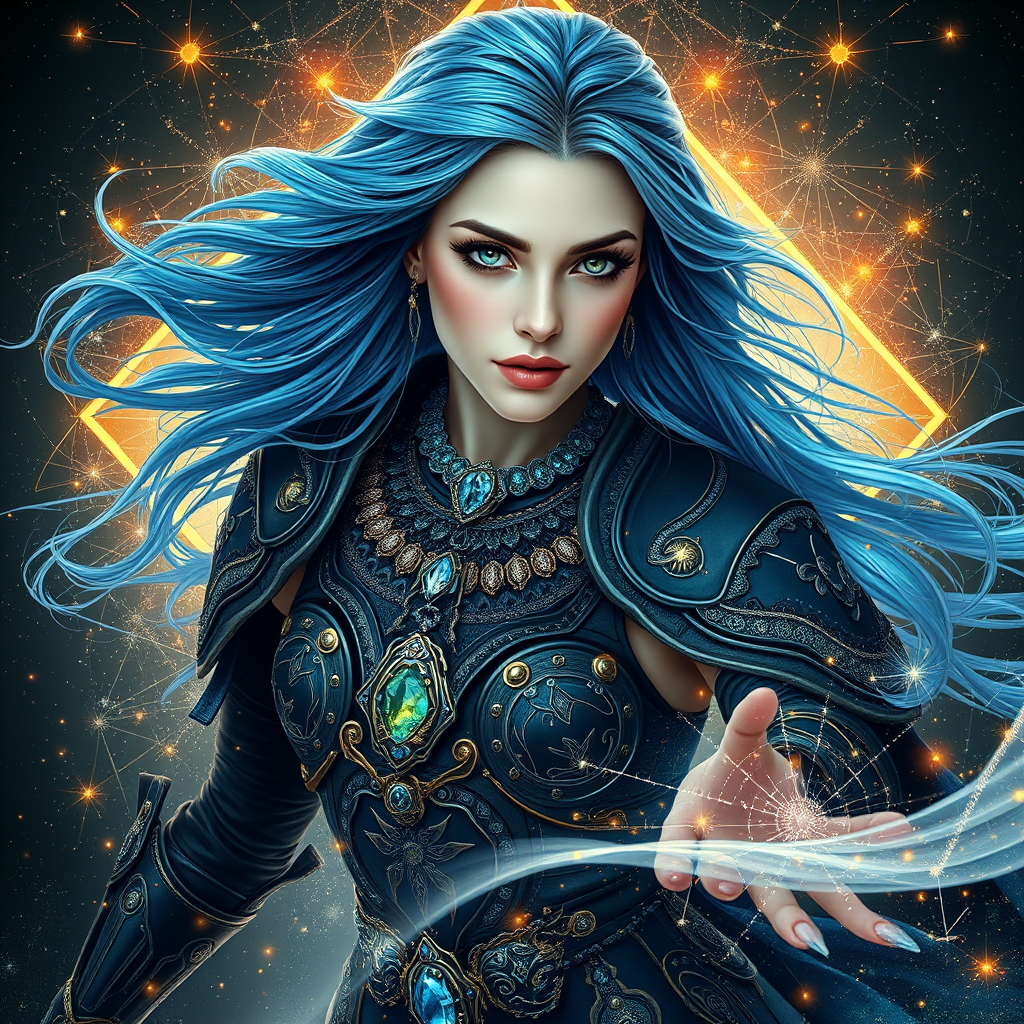 A breathtaking full body portrait of an enchanting woman in motion, her alabaster skin contrasting with a mesmerizing gemstone necklace that encapsulates the universe. Her long, flowing blue hair cascades around her, and her captivating green eyes exude a femme fatale allure. Clad in intricately designed jet-black battle armor, adorned with exquisite ornaments, she embodies desire and charisma. The scene features a double exposure effect, with her form glowing against an artistically complex background, enveloped by a delicate cosmos web shaped like a diamond. This cinematic and ethereal composition boasts perfect symmetry, showcasing exceptional craftsmanship and beautiful design. Captured in an ultra-wide shot, the vibrant colors and radiant light enhance the atmosphere. A halo of radiant energy surrounds her, and the ultra-realistic, insanely detailed illustration captures every nuance, making it a masterpiece of vivid artistry. Her presence is a beacon of ornamental splendor and captivating radiance.