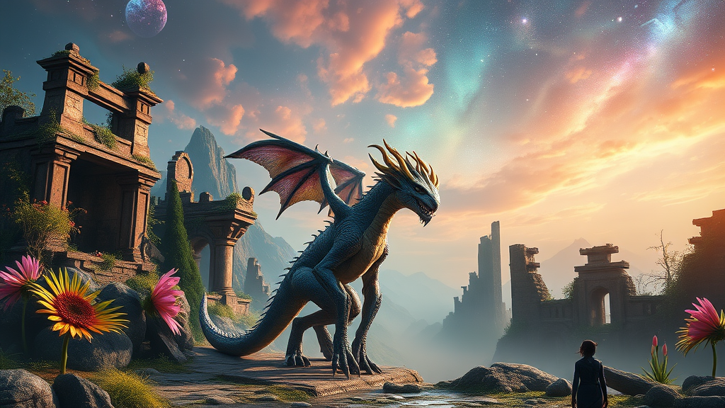 A breathtaking full-body portrait of an enchanting fantasy creature, captured with the precision of professional photography. The scene is a masterpiece brought to life as if rendered in an unreal engine, featuring extraordinarily high detail. Set on a fantastical planet filled with vibrant colors and dreamlike landscapes reminiscent of both Jean Ansell's and Justin Gerard's artistic styles, with hints of Greg Rutkowski’s dynamic lighting. Lush, exotic plants and intricate fauna intertwine with the creature, adding layers of wonder. The cinematic scene is set amidst ancient, weathered ruins, their stories whispered in the winds. Coloured nebulas paint the sky with ethereal hues, while the ground is veiled in a gentle mist, creating a surreal, otherworldly atmosphere. This magical tableau invites exploration, evoking a sense of awe and adventure.