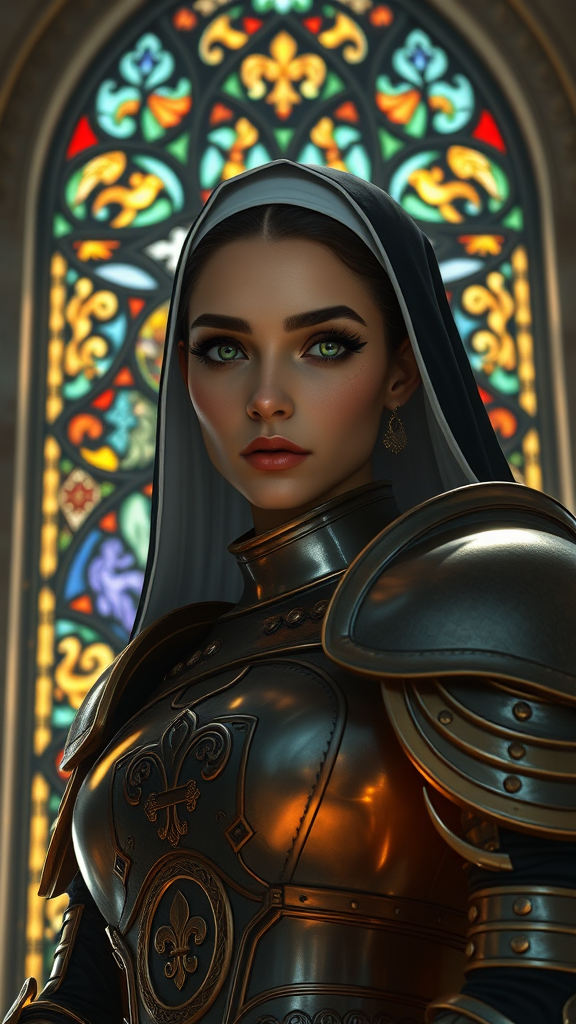 A breathtaking, full-body portrait of an extraordinarily beautiful woman embodying a sister of battle, poised with grace in front of a magnificent stained glass window. Her skin, a warm olive, is adorned with a delicate fleur de lys tattoo. Her armor is detailed with wax seals, capturing the sci-fi nun aesthetic iconic to Warhammer 40k. Her eyes are reflective and alive, framed by dramatic dark eyebrows and expertly applied makeup that highlights her detailed symmetrical face. Her eyelashes lend an additional touch of elegance. The armor glows under intricate lighting, enhanced by rim lighting and dramatic chiaroscuro effects. The scene is reminiscent of a professional oil painting inspired by masters like Waterhouse, with a modern twist from artists like Jeremy Mann and Greg Manchess. The backdrop of marble walls adds a touch of grandeur, as dust particles dance in the air, illuminated by the detailed lighting. The impression is both majestic and mystical, all while being rendered in an intricately high-detail style. This piece is a fusion of influences from Studio Ghibli, trending themes on ArtStation and CGSociety, blended with the ethereal touch of Makoto Shinkai's Kyoto-inspired landscapes.