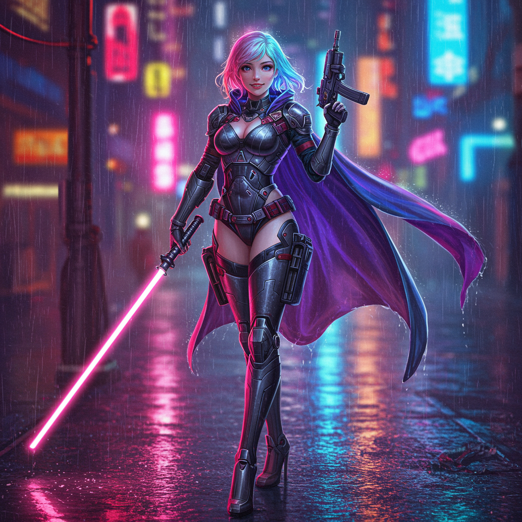 A breathtaking full body shot at 8k of an exquisite artwork depicting a futuristic female figure adorned in sleek sci-fi armor, illuminated by vibrant neon lights. She stands confidently in a cyberpunk city under the glimmering rain, wielding a laser saber and a sci-fi gun. Her alluring presence is heightened by her large, expressive eyes and a warm, self-assured smile. Her multi-colored hair glows brilliantly, complemented by the transparency of her flowing cape. The scene is steeped in intricate details with reflections and lens flares adding to the realism. She wears towering high heel boots, embodying strength and elegance. The painting resonates with nostalgia and is photo-realistically crafted, reflecting the artistic influences of Ed Binkley, Atey Ghailan, Studio Ghibli, Jeremy Mann, Gregory Manchess, and Antonio Moro. This masterpiece is a trending sensation on ArtStation and CGSociety, exhibiting sharp focus and dramatic artistry in line with midjourney and Greg Rutkowski's signature styles. The dynamic atmosphere and detailed craftsmanship create a mesmerizing blend of realism and fantasy, embodying the perfect harmony of urban futurism and artistic skill.