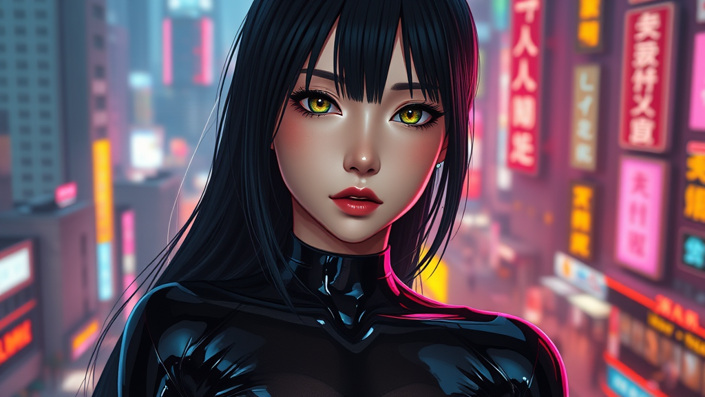 A breathtaking full-body shot of Reika, adorned in a sleek black latex bodysuit, her straight black hair cascading over her shoulders. Set against the backdrop of a vibrant cyberpunk cityscape, reminiscent of the Gantz universe and Cyberpunk 2077 style. Her exquisitely detailed, ultra-realistic face captivates with jewel-like eyes, glowing under chiaroscuro lighting and neon hues. The scene bursts with anime-inspired artistry and cinematic depth, capturing every intricate detail and vibrant color. While maintaining the core essence, subtle creative touches enhance the atmosphere, exuding a high-definition, masterpiece quality that is wallpaper-worthy and strikingly immersive.