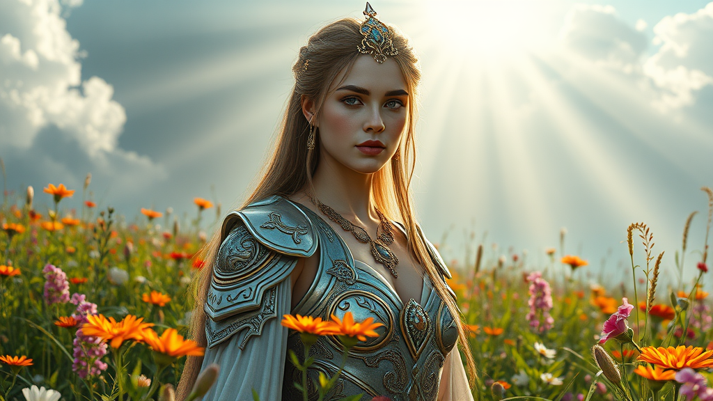 A breathtaking full-length portrait of an exquisite goddess standing gracefully in a lush meadow brimming with vibrant flowers, her captivating face intricately detailed. Her full body is adorned in delicate, minimalistic armor that accentuates her divine elegance. Sunlight filters through the clouds, casting ethereal god rays around her, enhancing the cinematic and realistic ambiance. The scene is intricately composed with high attention to detail, showcasing an elaborate and refined character design. This digital painting encapsulates the essence of hyperrealism, capturing the depth of field and offering a stunning visual experience filled with artistic depth and creativity.